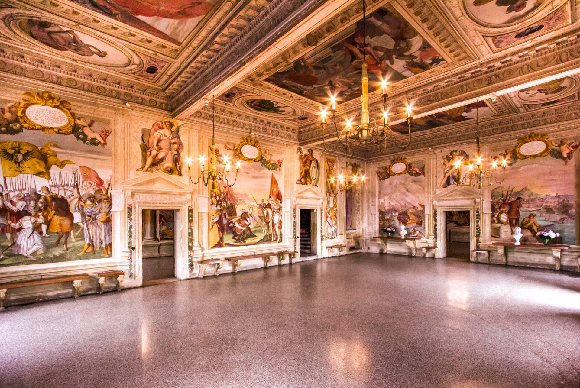 Salendo le scale (progettate per essere percorse anche a cavallo!), si accede al Piano Nobile. Qui la meraviglia aumenta. Pio Enea commissionò a Giambattista Zelotti, allievo del Veronese, la decorazione delle pareti.