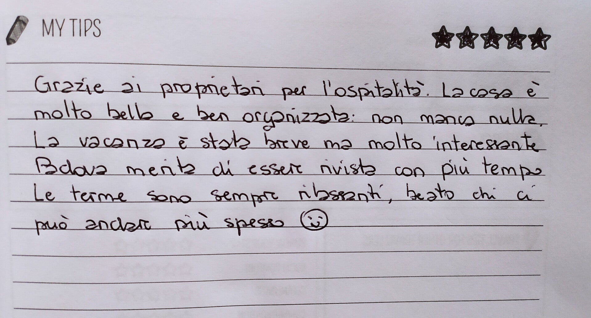 "Siamo felici di ospitare viaggiatori da tutto il mondo e di condividere con loro la bellezza delle Terme e del nostro territorio. Ogni recensione è un piccolo racconto della loro esperienza a Casa Luna. Scorri in basso per leggere direttamente quello che i nostri ospiti hanno detto di noi e per scoprire perché hanno scelto di soggiornare qui".